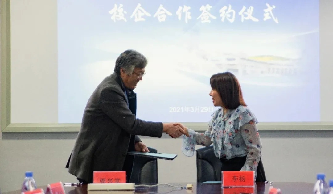 周興堂書記與李楊經理代表雙方簽訂校企合作協議。